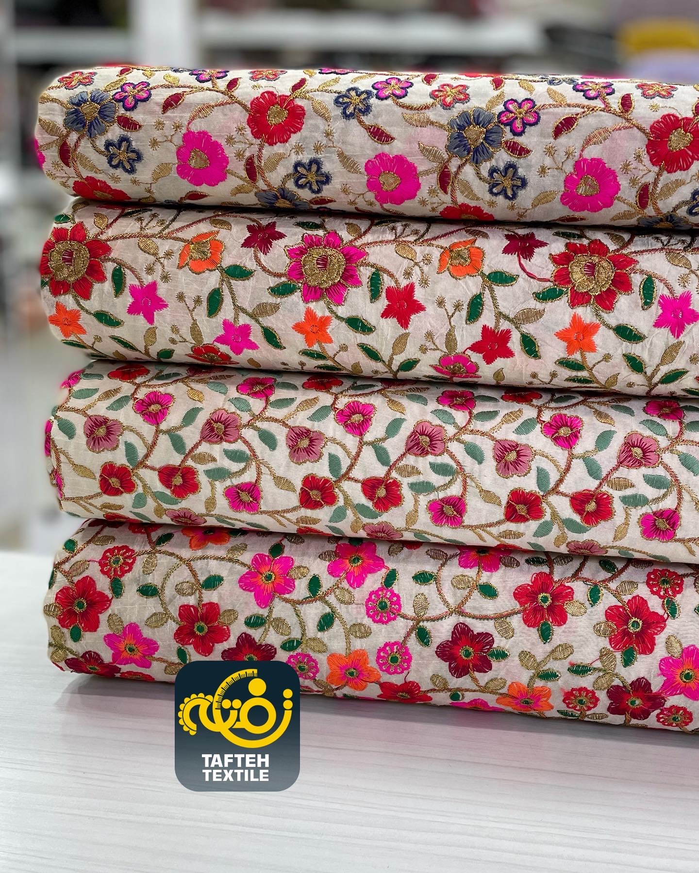 زمینه کار تافته ابریشم ، کش ندارد ، سوزن دوزی ، چروک و آبرفت ندارد، ایستایی دارد ، – کمترین متراژ برش نیم متر