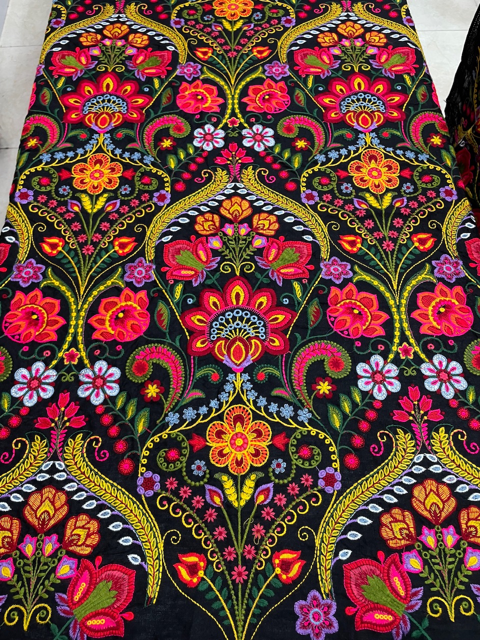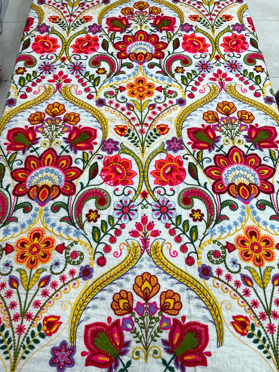 سوزندوزی های روی پارچه با تراکم بالا و نخ با کیفیت ابریشمی بافت شده و رنگ نخها واقعا شفاف و زیبا هست که نمای پارچه رو فوق العاده خاص و جذاب کرده است .